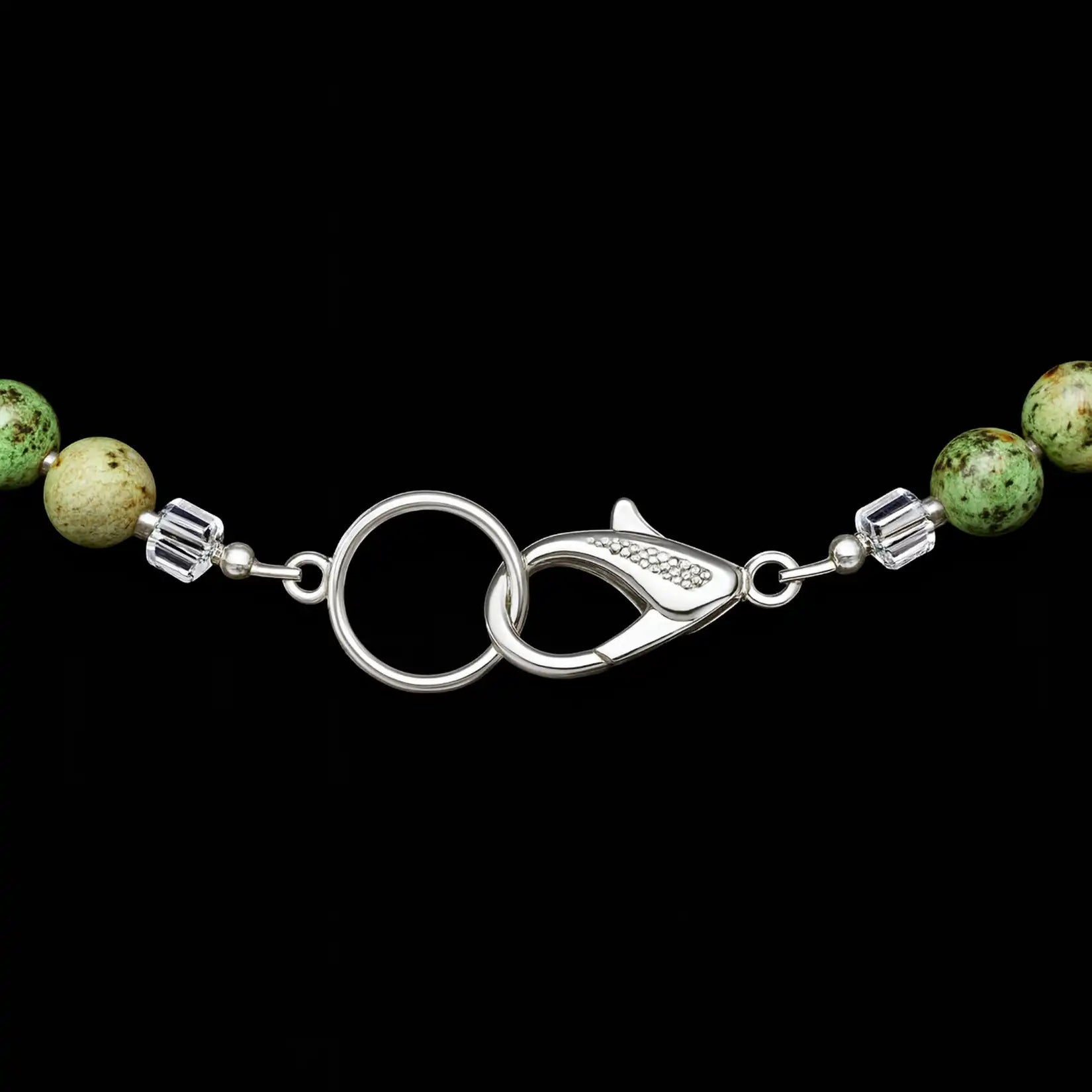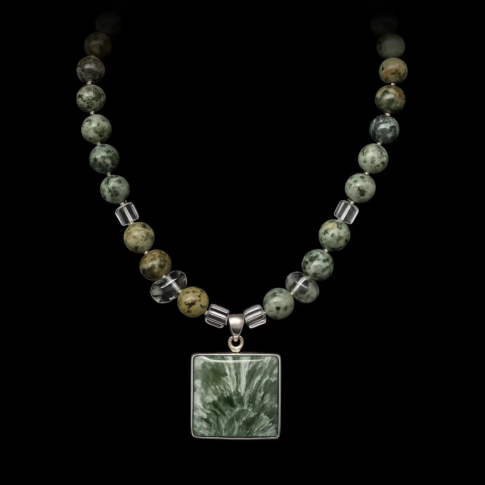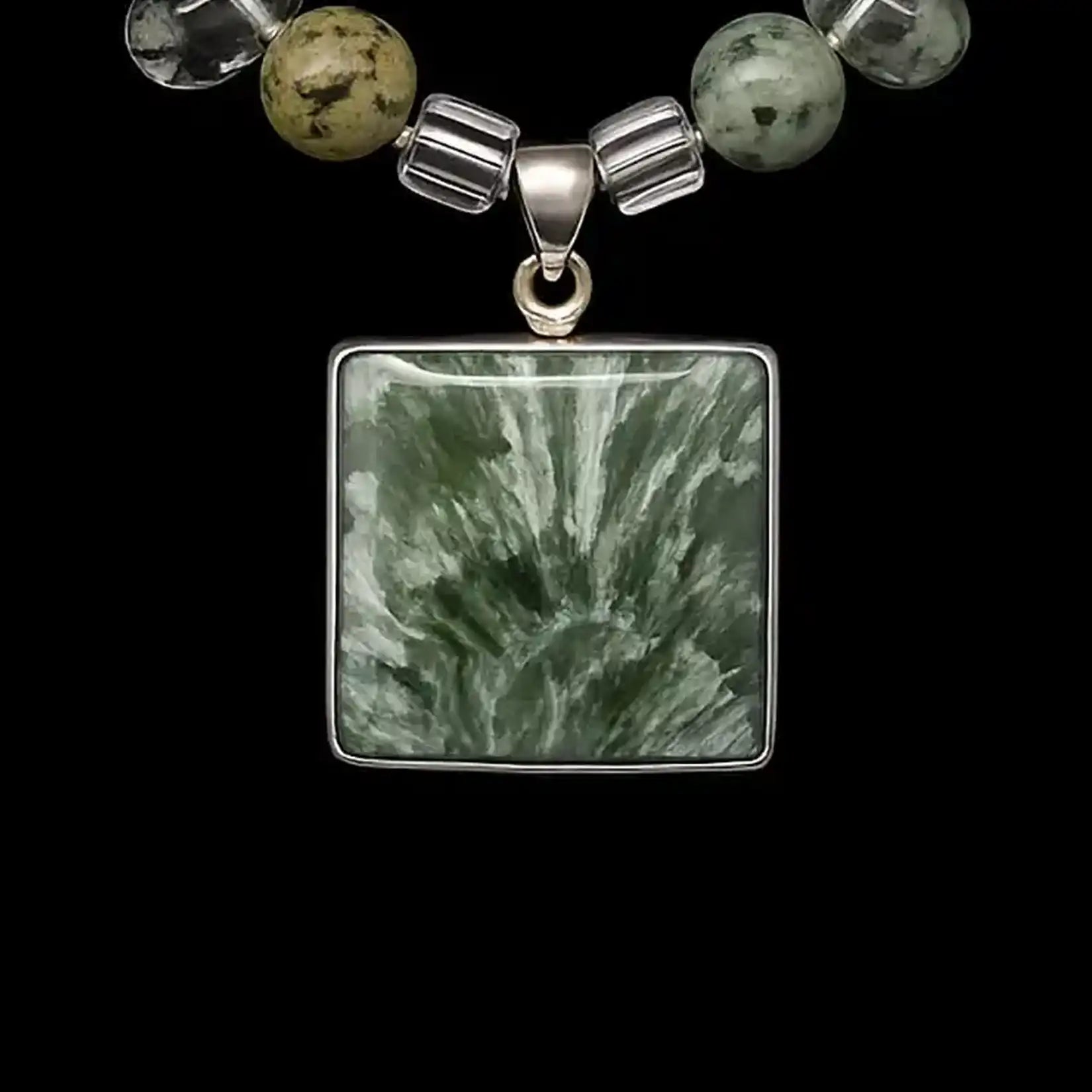 Soft mossy greens and silvery wisps drift along the neckline, graceful as feathered wings. At center, a square seraphinite pendant shimmers with angelic light, opening the heart to renewal and gentle protection. African turquoise encourages fresh beginnings and grounded growth, while crystal accents brighten clarity and invite sparkling opportunities. Polished silver gathers moonlight, weaving the strand into a quiet blessing. Wear her when you’re ready to start anew—centered, luminous, and lovingly guided.