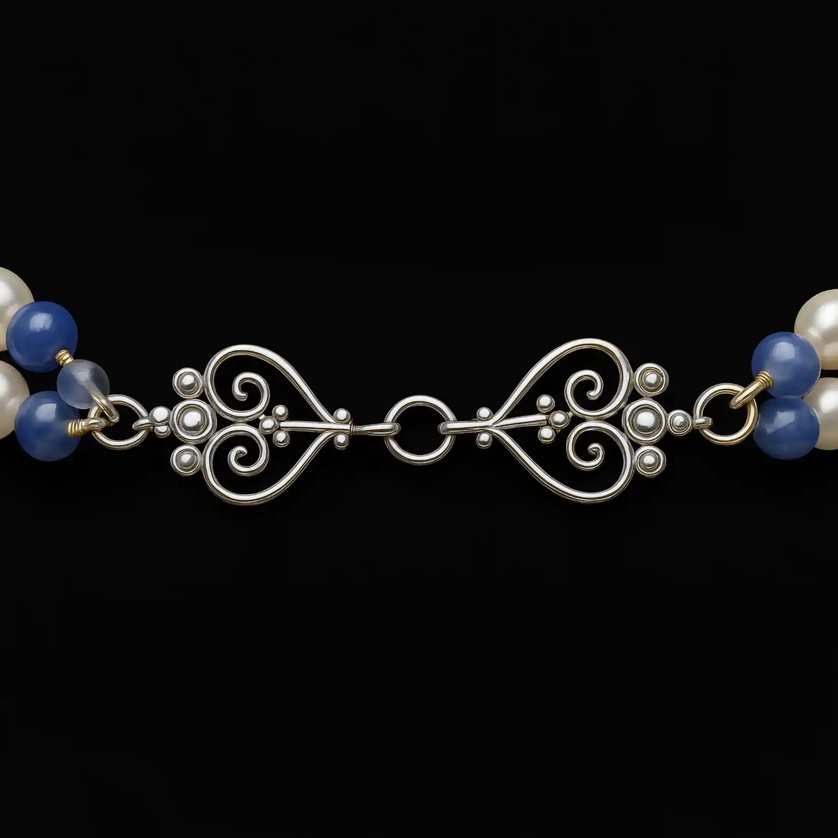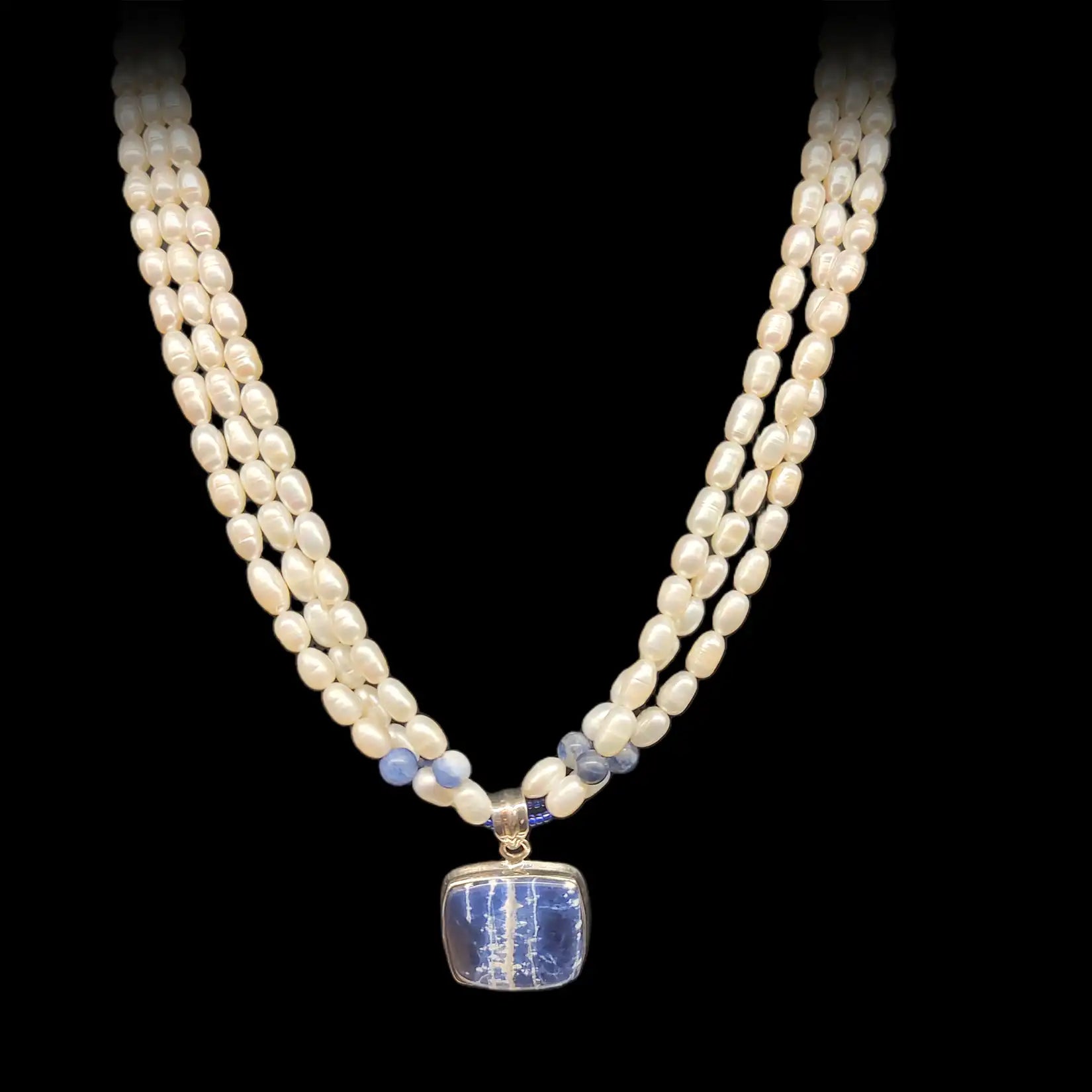 A graceful double strand of pearls drapes like moonlit water, feminine and composed. At the heart, a square sodalite—deep Canadian blue—rests in silver, a talisman for clear voice, wise intuition, and the courage to speak with kindness. Sodalite marries logic with inner knowing, steadying nerves so truth can flow. Pearls soften the aura with purity and poise, while silver gathers a quiet shine. Wear her when you want calm confidence and beautifully guided words.