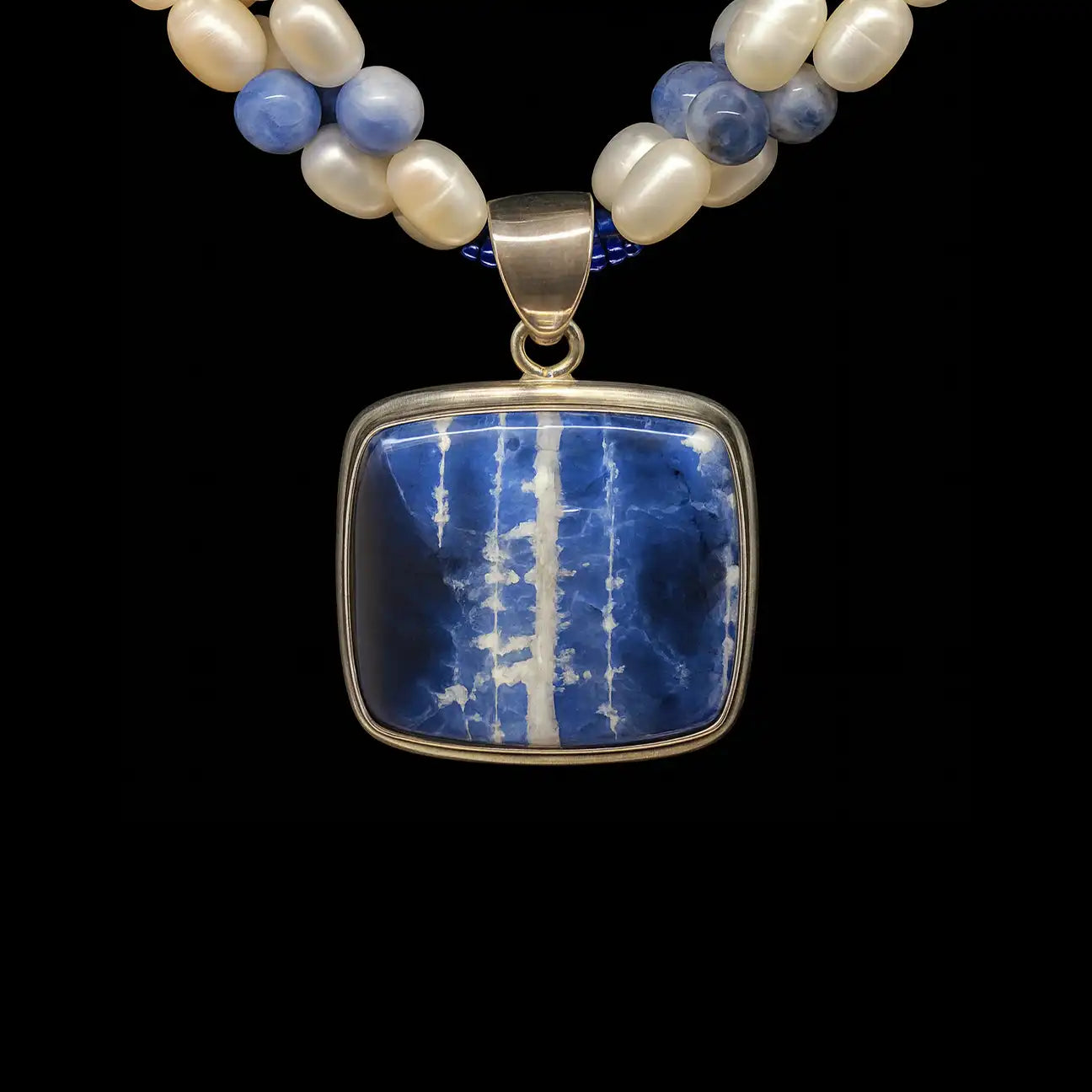 Square Sodalite Pendant (Canadian Blue Stone) wrapped in Silver, Sodalite Beads, Pearls, Sterling Silver Clasp. 20 inches.