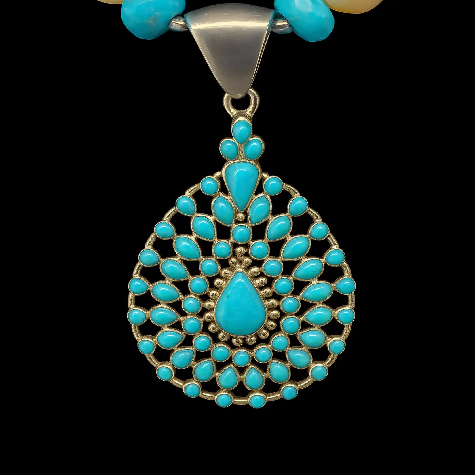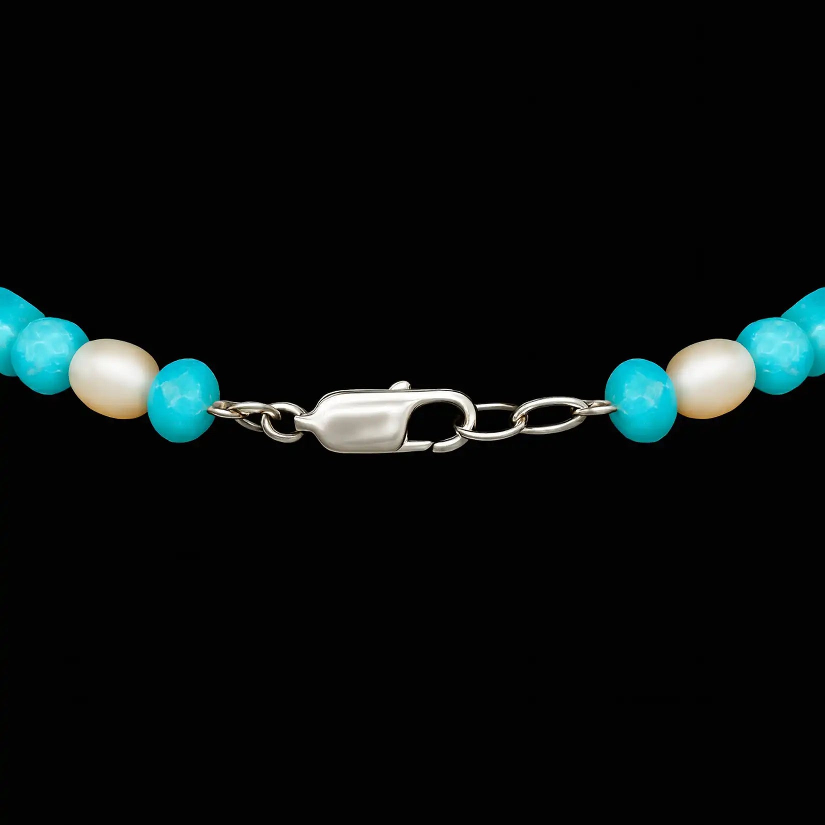 Cool howlite squares and luminous pearls trace the neckline like sea-kissed lace—fresh, feminine, and serene. At center, a silver teardrop pendant shimmers with delicate howlite, a gentle stone of patience that softens worry and steadies the heart. Crystal spacers add a quiet sparkle, while silver gathers moonlit calm so your presence feels poised and soothing. Wear her when you crave grace under pressure and a peaceful voice that carries beautifully.