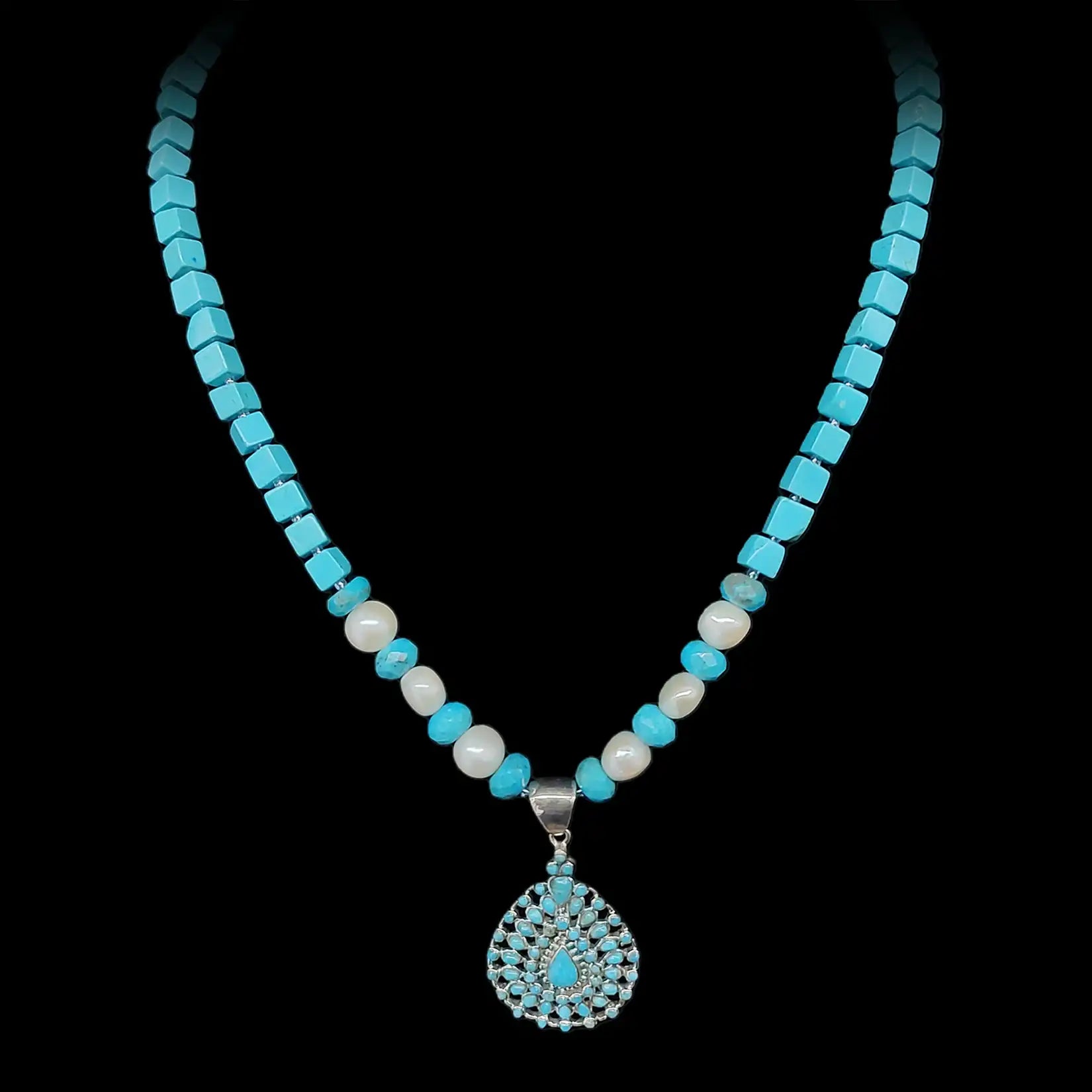Howlite and Silver Drop, Pearls, Square & Cut Howlite Beads, small Crystal spacers, Silver Clasp. 19 inches.