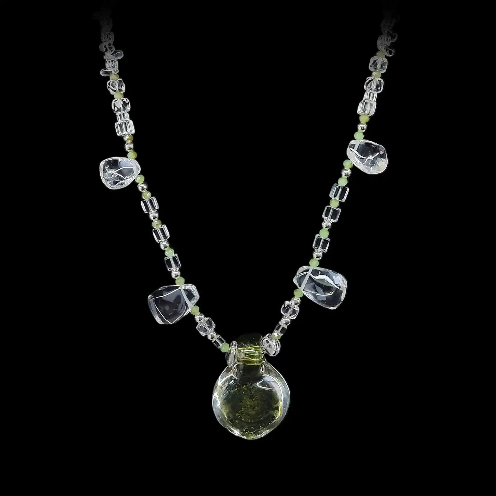 Delicate crystals and silver catch the light like morning dew, leading to a round blown-glass pendant tinted soft meadow green. She feels airy and feminine—an amulet of clarity, renewal, and sweet optimism. Clear crystal brightens intention; tiny green sparkles open the heart to kindness and steady growth. Silver gathers moonlit calm, balancing shine with serene grace. Wear her for fresh starts, gentle courage, and a spirit that glows as softly as spring.