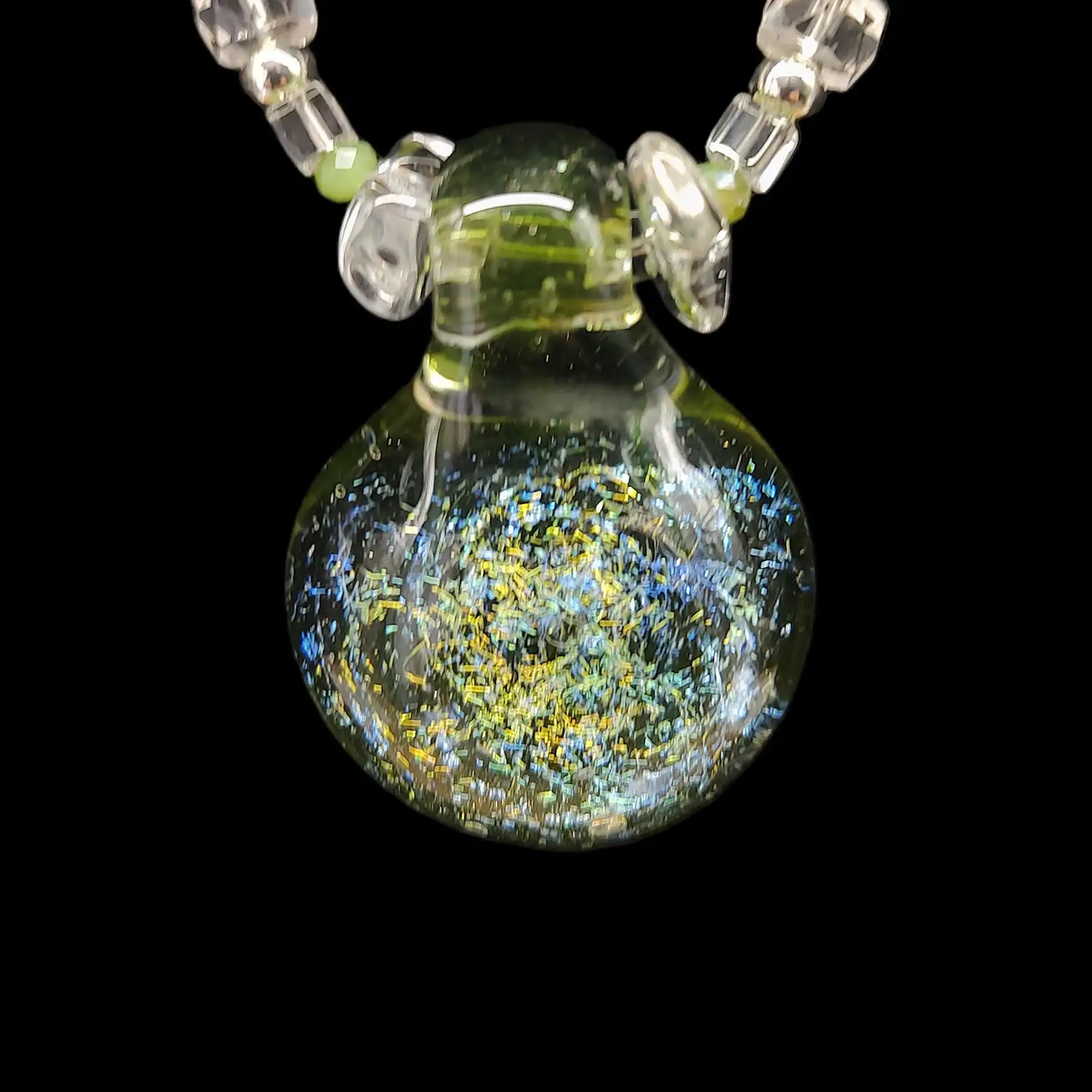 Blown Glass Pendant, Crystal Beads, Silver Beads, Tiny Green Crystal Beads, Sterling Silver Clasp. 22 inches.