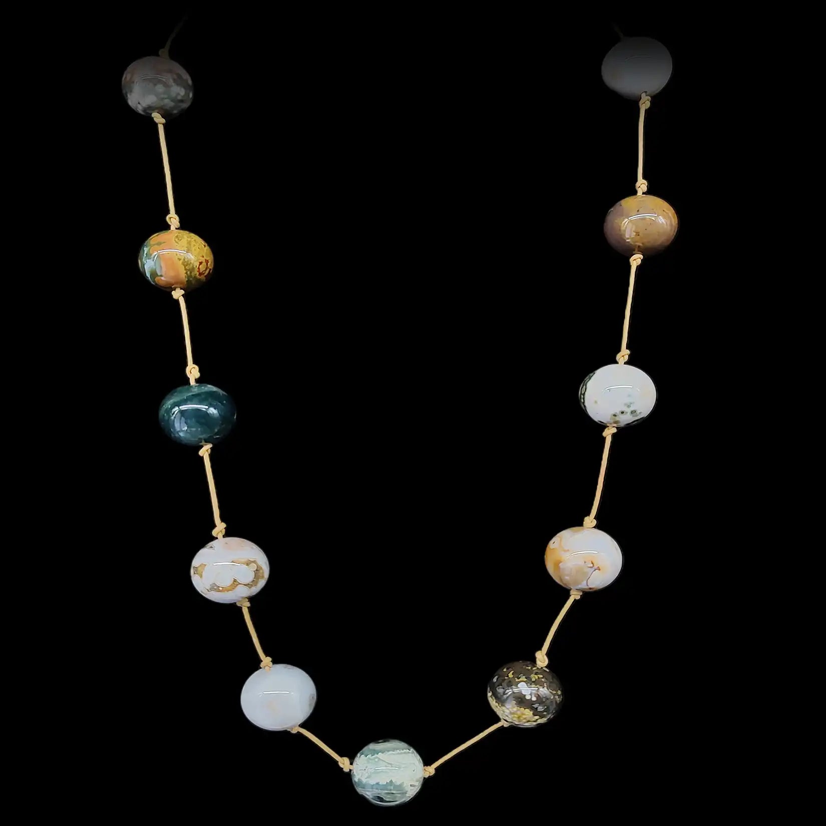 Ocean Jasper Large Beads knotted on Leather String. 30 inches.