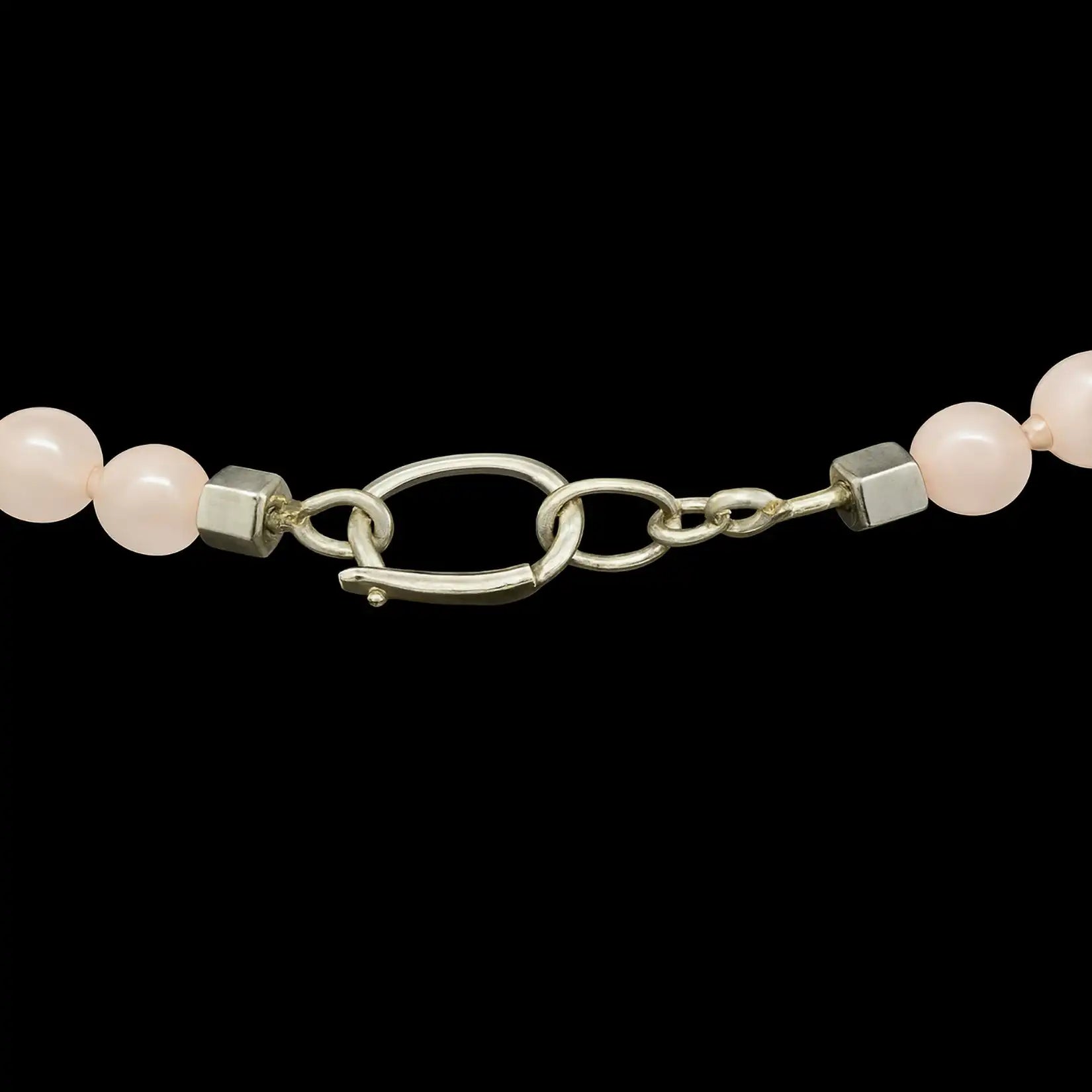 Warm rose-pink rhodochrosite glows like a petal caught in morning light, framed in sterling silver and balanced by crystal clarity, earthy red jasper, and tender morganite. The strand moves from soft translucence to grounded warmth, creating a graceful harmony around the heart. Rhodochrosite’s loving pulse invites compassion and ease, while red jasper steadies, crystal purifies, and morganite opens the doorway to gentle connection—a radiant talisman for heartfelt bonds and sweet, confident presence.