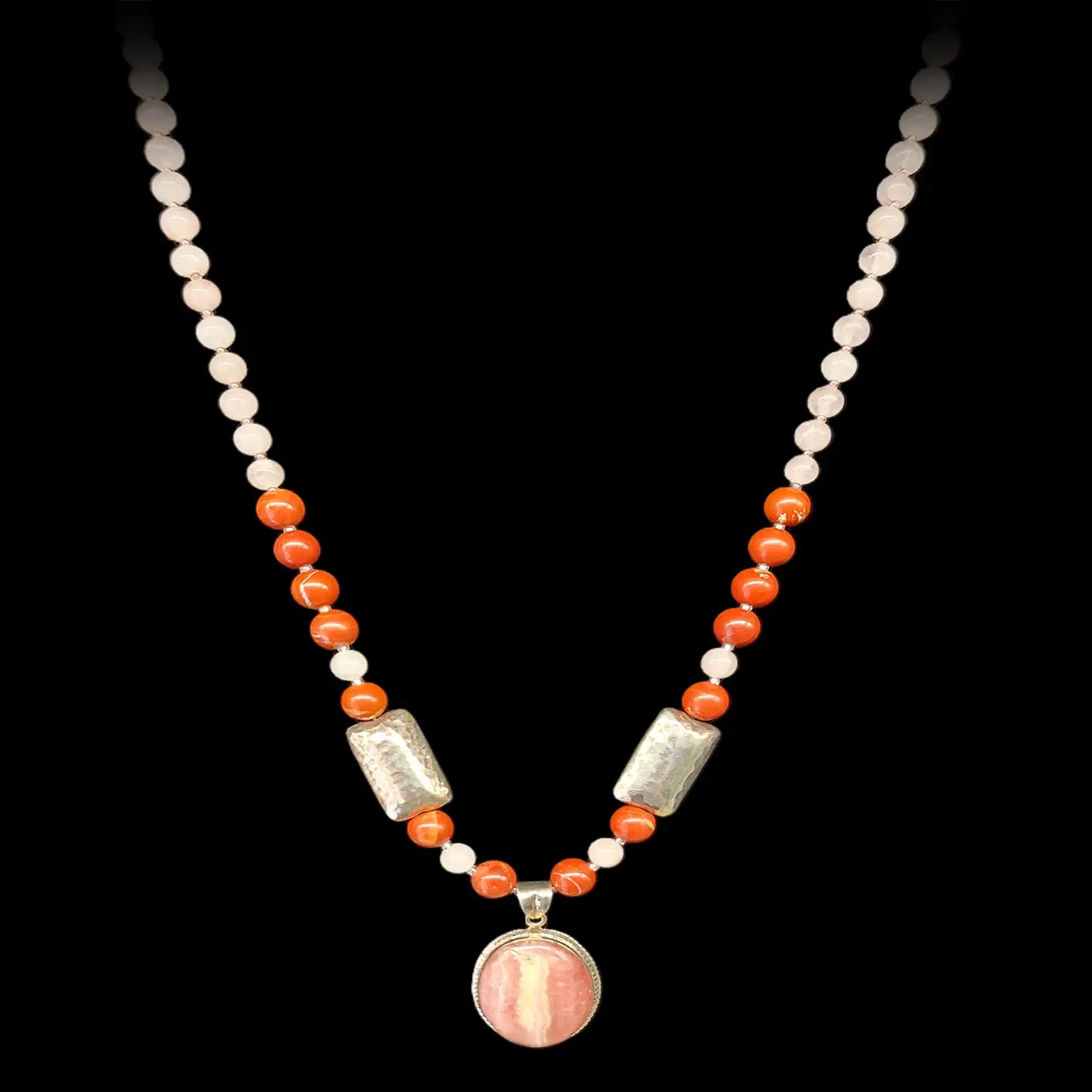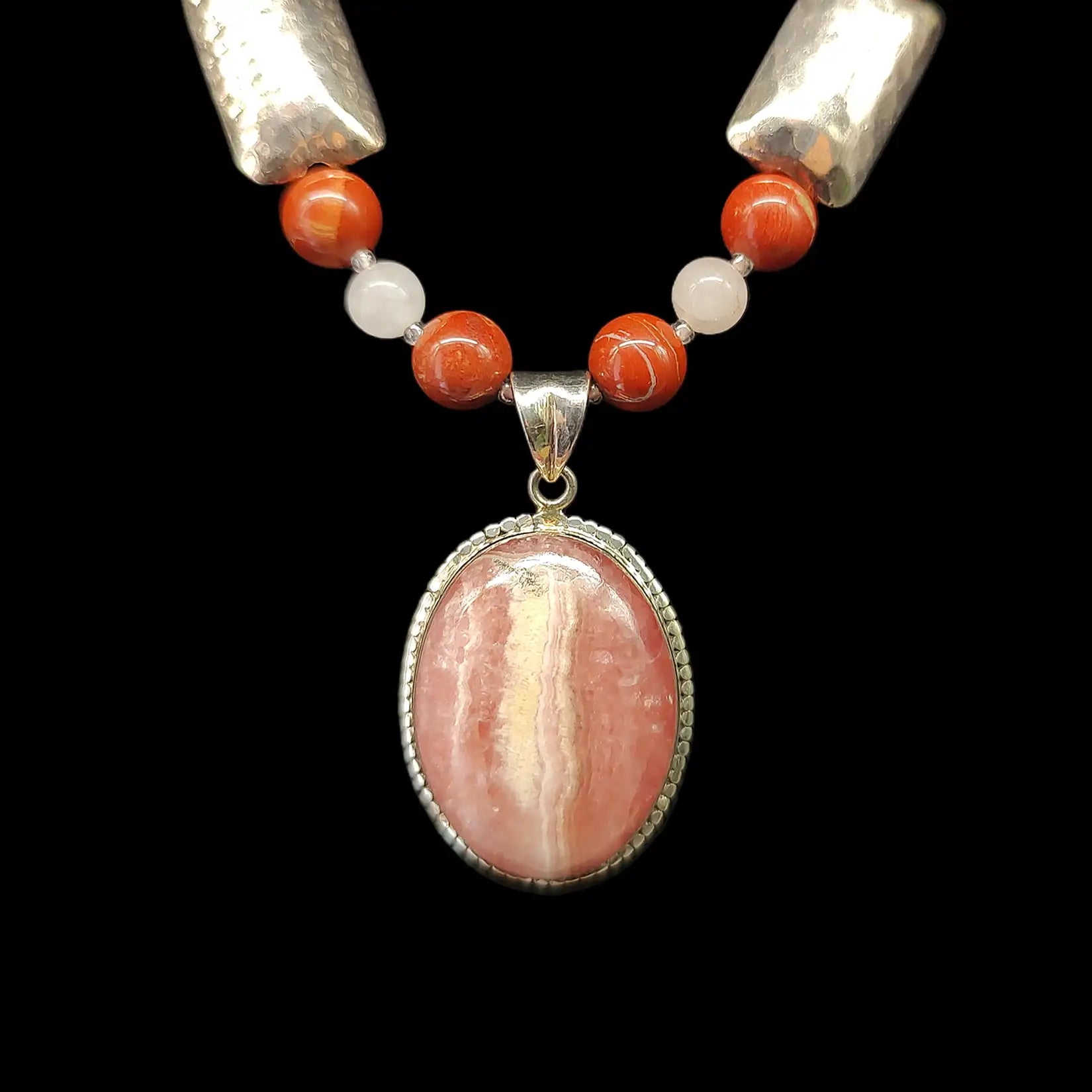 Rhodochrosite Stone Drop set in Sterling Silver, Crystal Beads, Red Jasper Beads, Morganite Beads, Silver Beads, Silver Clasp. 26 inches length.