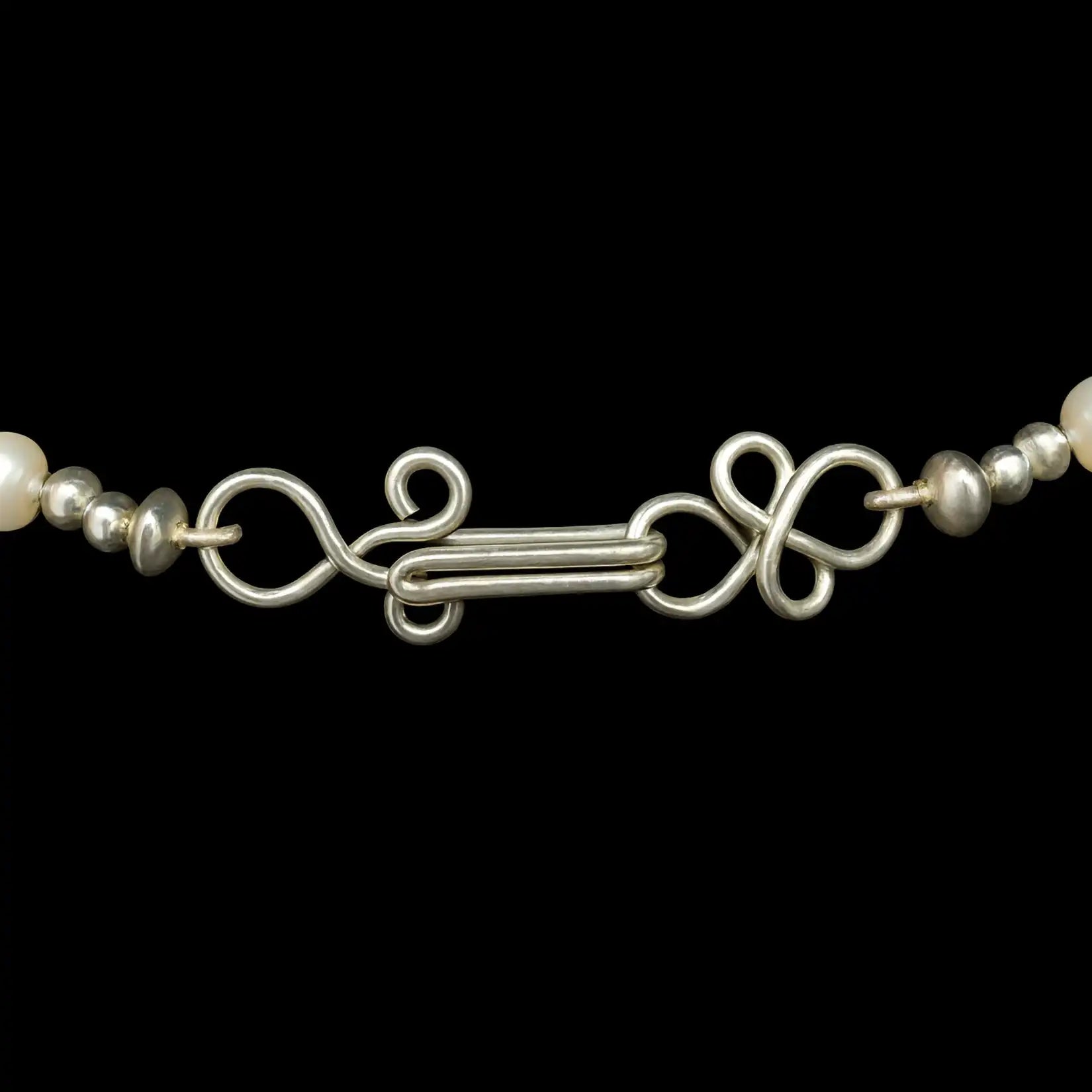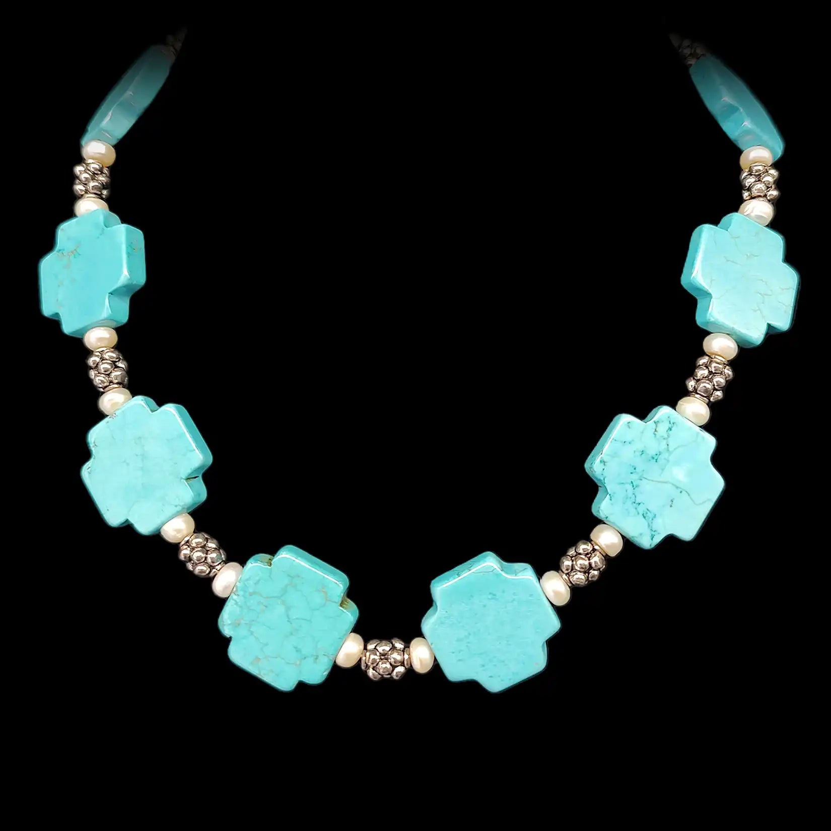 Sky-blue howlite blossoms float among pearls and silver, as fresh as a clear morning. The sculpted stones quiet noise and slow the breath, inviting patience, balanced thoughts, and softhearted grace. Pearls lend purity and poise while silver gathers moonlight to seal the calm. Reach for her when the day turns busy—she steadies emotion, eases worry, and opens space for kind words and clear choices, leaving you centered and softly luminous.