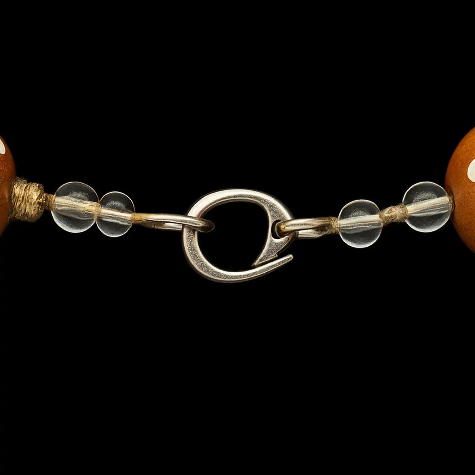 Warm, glossy wooden orbs move like smooth river stones, each softly haloed by sparkling crystals that catch every turn of light. This strand carries earth’s steady heartbeat—grounding, patient, quietly confident—while the crystals brighten intention and lift the spirit with clear, twinkling energy. Sterling silver mirrors moonlight, sealing calm with a touch of polish. Slip it on for rooted grace and a gentle radiance that lingers long after goodbyes.