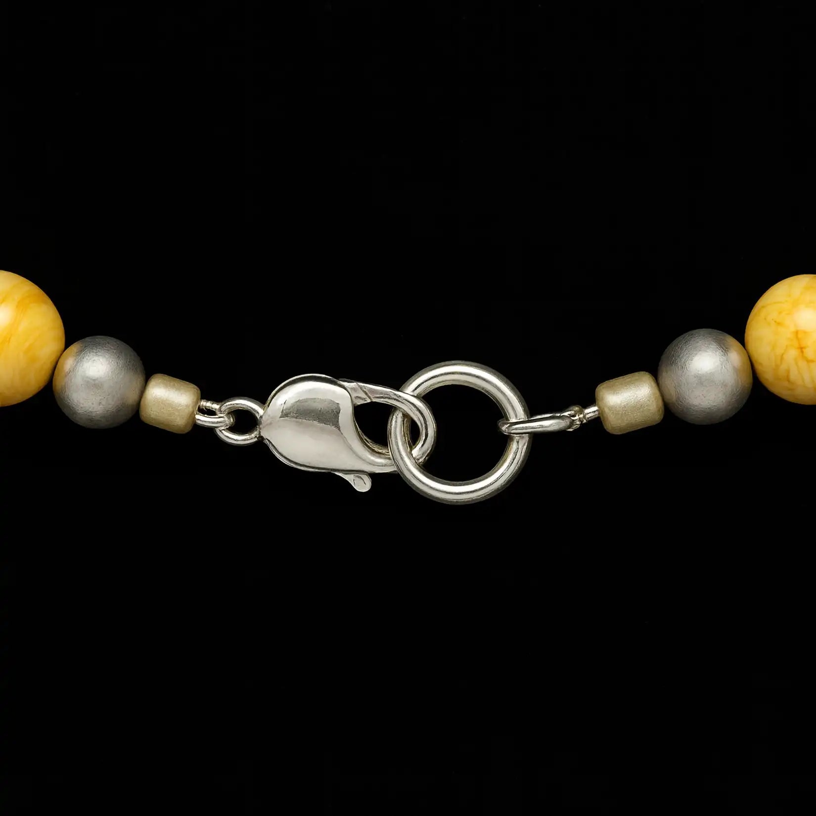 Honeyed rounds of polychrome jasper glow along the neckline, brightened by tiny crystal sparks and cool silver. At center, a triangular yellow jasper pendant gathers warm sunlight—steadying the heart, lifting optimism, and fortifying endurance when life asks for grace and grit. Jasper’s grounding rhythm calms the nerves, nurtures perseverance, and invites kind confidence in your own path. Slip it on for steady glow, resilient spirit, and a softly radiant presence.