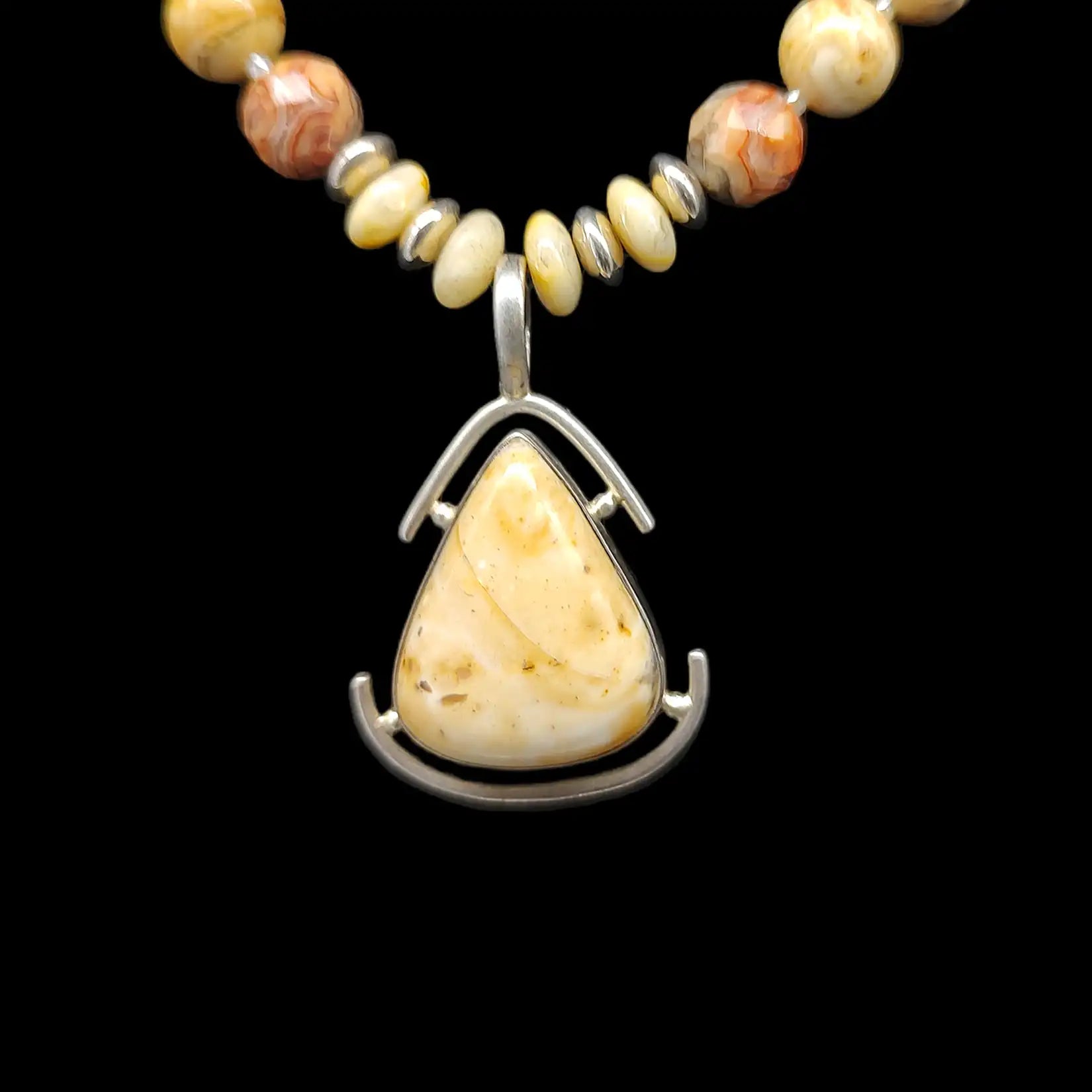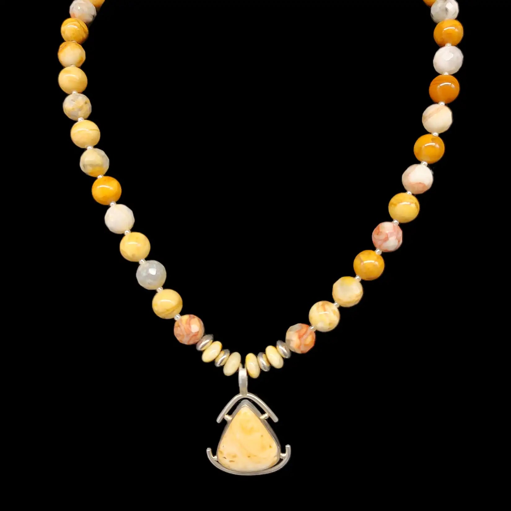 Yellow Jasper Pendant set in Sterling Silver, Polychrome Jasper Faceted Beads; with little Crystals spacers, Silver Beads, and Sterling Silver Clasp. 18 inches.