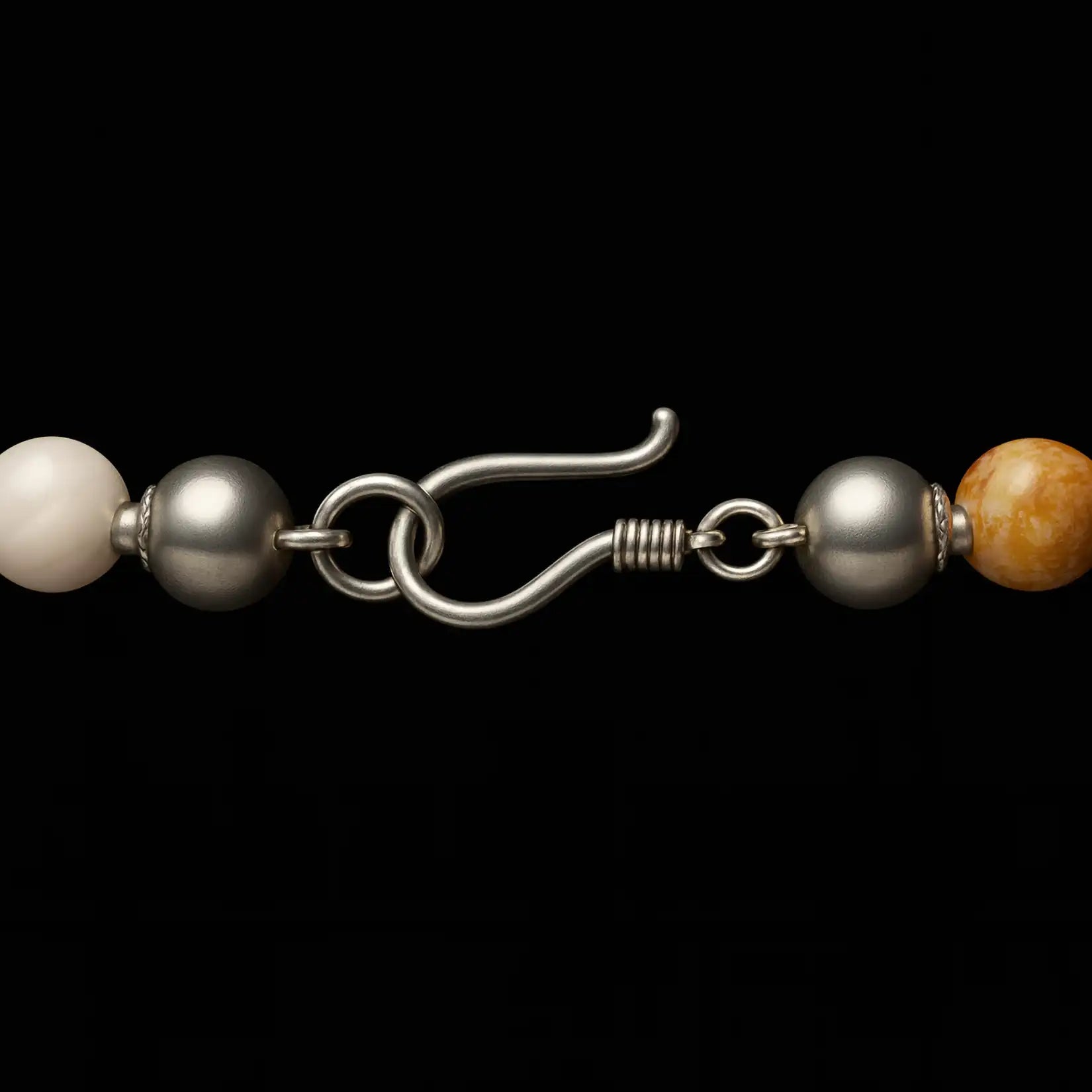 Soft lilac fluorite and glints of crystal drift between luminous pearls and silver—a serene halo with a radiant hush. At center, an opalized fluorite pendant glows in clouded lavender, guiding intuition, clear decisions, and tender self-trust. Amethyst deepens calm and offers gentle protection; pearls smooth the heart’s tides so words arrive with grace. Silver gathers moonlit clarity, weaving everything into a quiet blessing for reflective mornings and enchanted evenings.