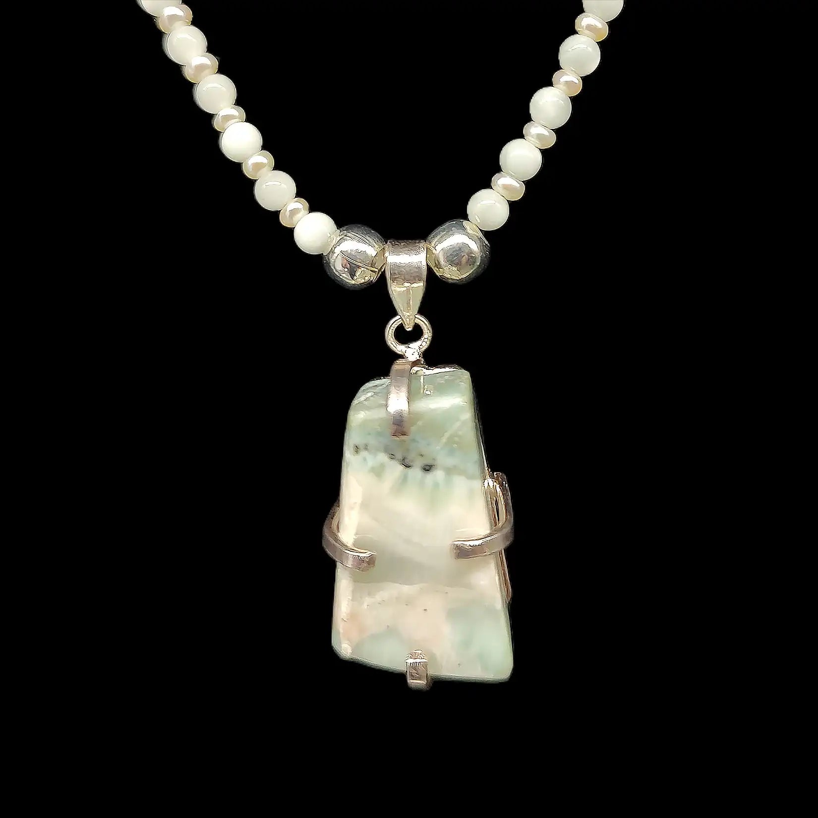A delicate river of silver beads draws the eye to a softly sculpted larimar drop, its sea-blue marbling cradled in sterling like sunlight on calm water. The look is graceful and serene, perfect for moments when you want quiet confidence with a touch of shimmer. Larimar is cherished for clear communication and inner wisdom, carrying the tranquil energies of sky and sea to soothe the heart and steady the voice—an elegant companion for peaceful presence.